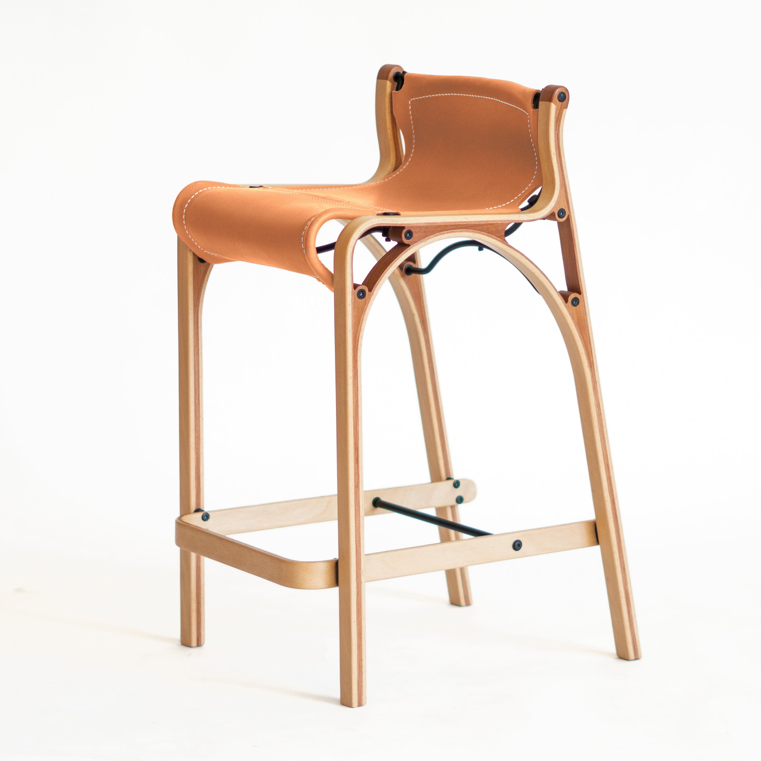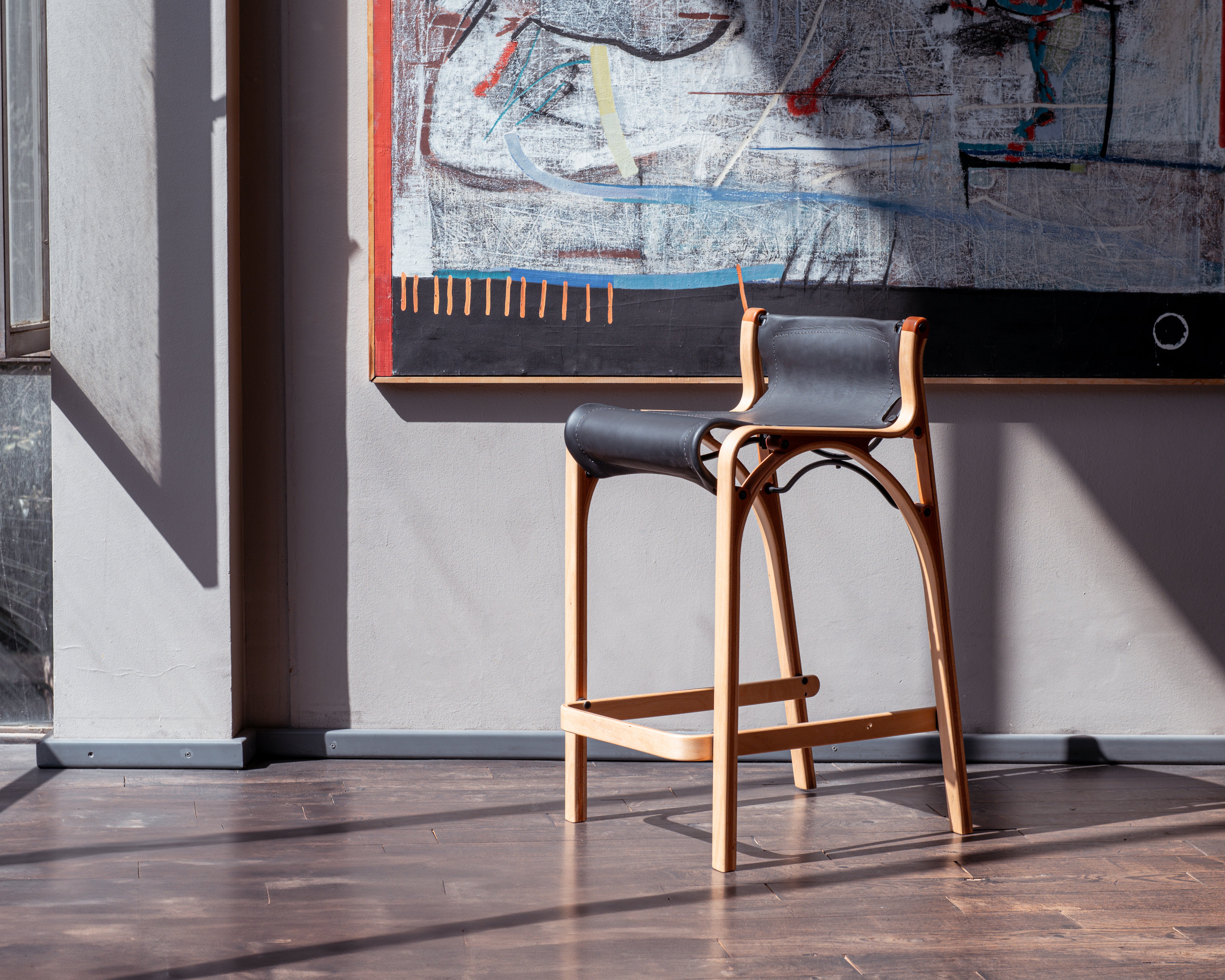 El Piso PB se compone de una estructura metálica de acero trefilado en frío, una funda de cuero natural de vacuno con curtido vegetal, y sus costillas o patas son de maderas de haya y ulmo laminadas, con insertos de roble vaporizado en los puntos de unión y terminaciones. El apoya pies de madera laminada en conjunto con una barra de acero trefilado rigidizan el Piso proporcionándole gran estabilidad.